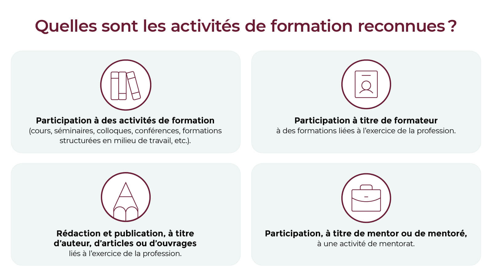 Afin de remplir votre obligation de formation continue, vous pouvez choisir, parmi les activités de formation admissibles, celles qui répondent le mieux à vos besoins .