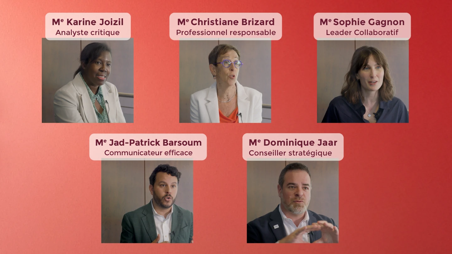 Découvrez comment cinq avocats et avocates parmi les plus estimés de la profession incarnent au quotidien chacun des rôles du référentiel de compétences : analyste critique, leader collaboratif, communicateur efficace, professionnel responsable et allié stratégique. Des témoignages inspirants pour quiconque souhaite enrichir sa pratique professionnelle.