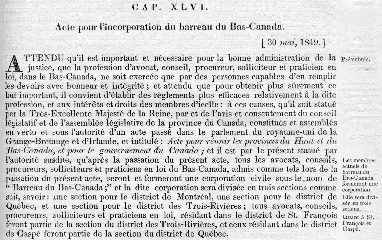 Le Barreau du Québec a fêté en 2024 son 175e anniversaire. Le 30 mai 1849, l’Assemblée législative de la province du Canada adoptait l’Acte pour l’incorporation du Barreau du Bas-Canada, signant ainsi la création de l’un des premiers ordres professionnels de la province.