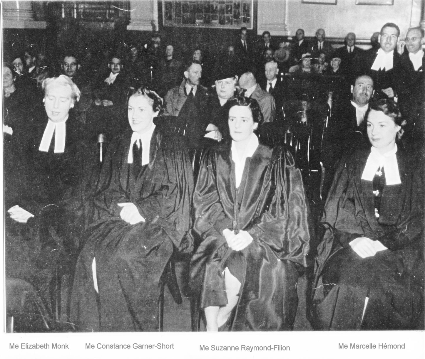 L’année suivante, Elizabeth C. Monk devient la première femme admise au Barreau du Québec, suivie la même année par Suzanne Raymond-Filion, Constance Garner-Short et Marcelle Hémond.